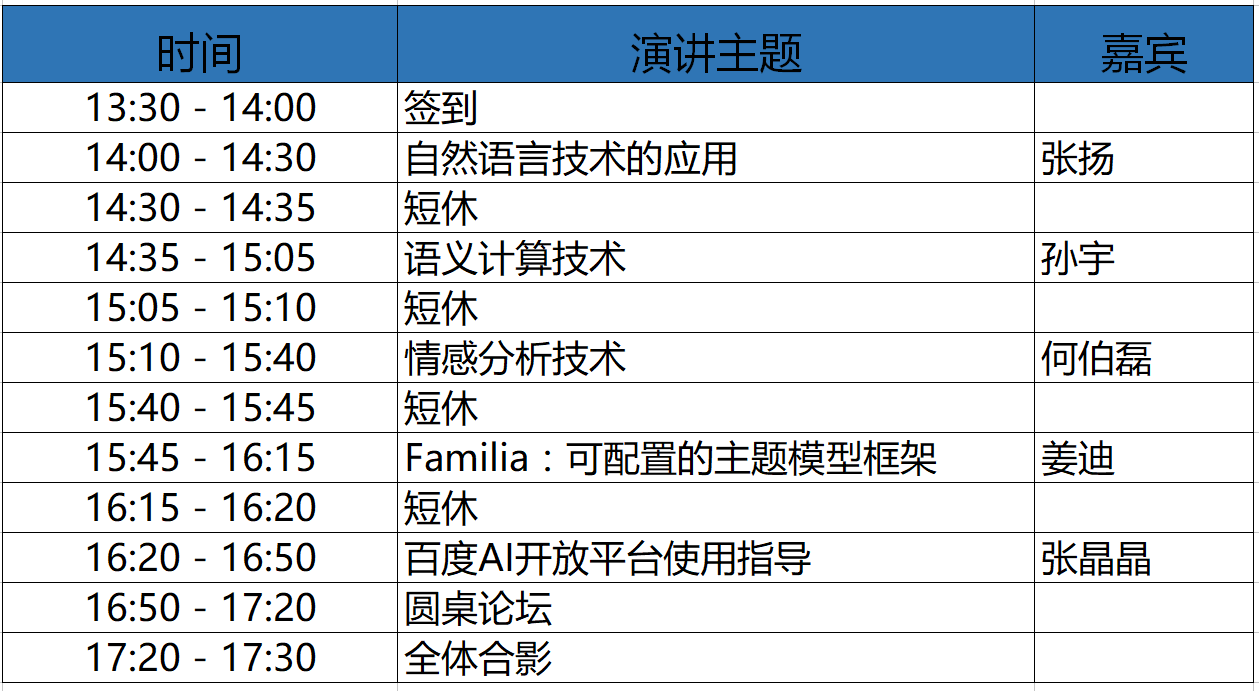 目前为止,百度开放了哪些 NLP 技术模块?如何使用?百度 AI 开放平台上的 80+ 核心技术怎样尽收囊中?本次 75 期百度技术沙龙,我们邀请到百度 NLP 和 AI 开放平台多位资深工程师、产品经理,为你送上一份技术人专属使用手册。