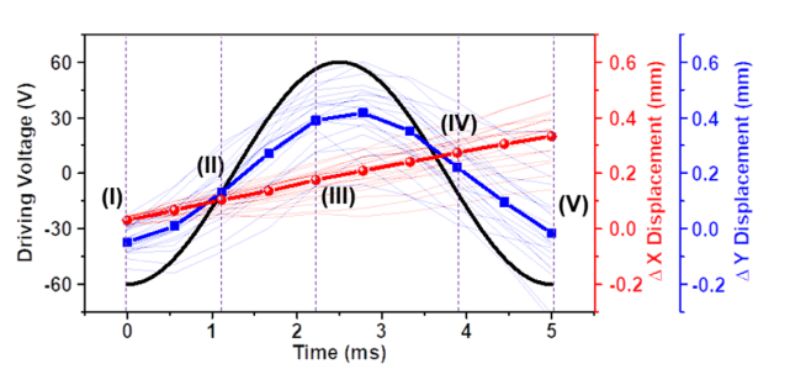 例如,下图展示了在- 60 ~ 60v(黑线)驱动电压下原型机器人的横向位移(红线)和纵向位移(蓝线)实验结果。