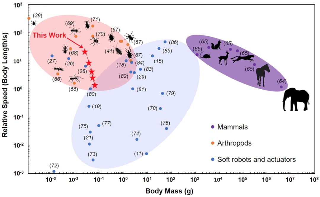 这张图表显示了一些哺乳动物(紫色区域)、节肢动物(橙色区域)和柔性机器人(蓝色区域)相对于其体重的运行速度。
