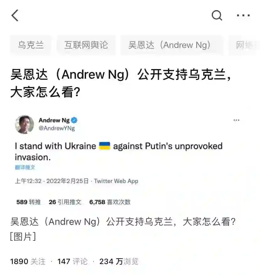 而说到底,吴恩达老师是个美国人。人家站在欧美的立场上,无视欧美的种种侵略、战争行为,选择站队乌克兰,似乎也没啥大问题。