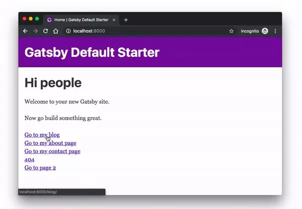 这将在 localhost:8000 上启动项目,在浏览器中打开这个地址就能看到你的 Gatsby 项目了!