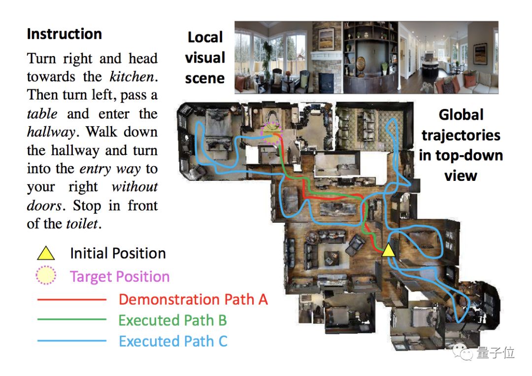 在这个任务中,AI接收到的是“向右走,走向厨房,之后左转,经过一张桌子后进入走廊”等一系列自然语言指令,它看到的是一部分空间中的场景,但需要分析语言中对应的物体即动作,还要脑补出整张空间图。