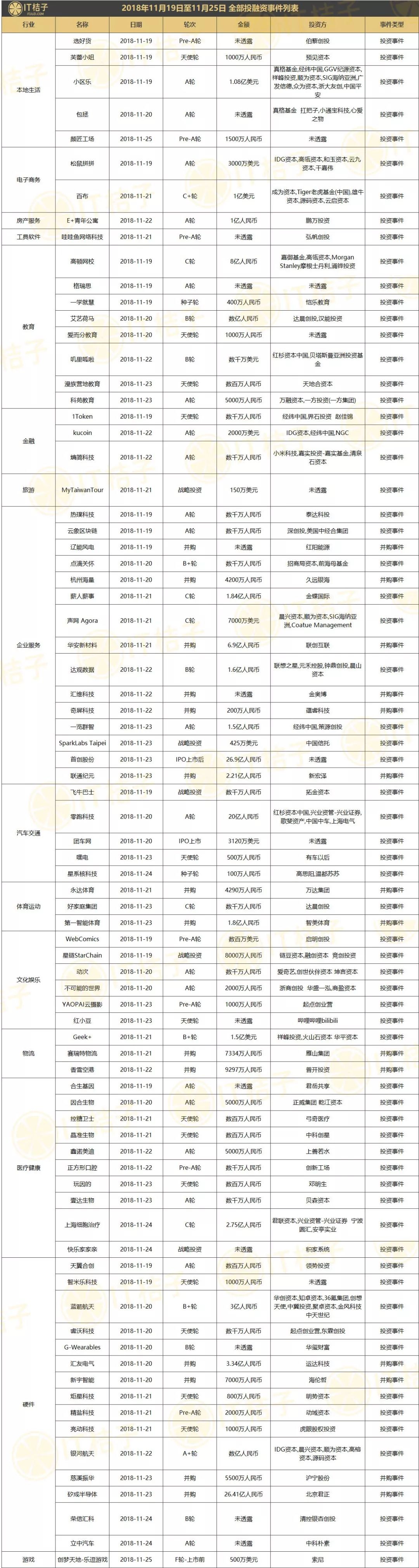 上周全部投融资事件列表: