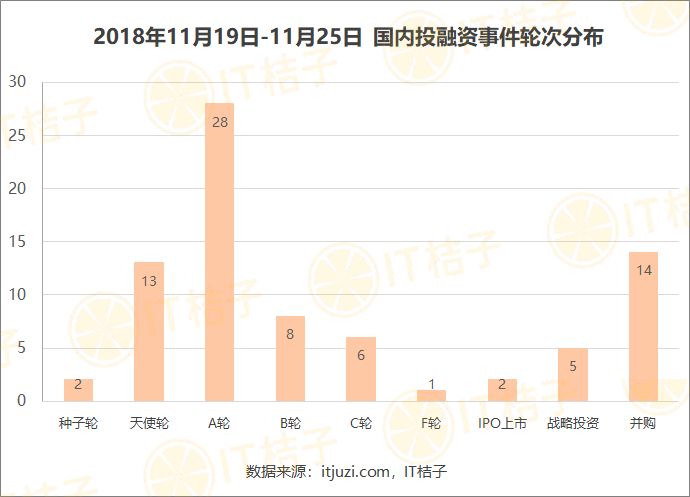 从轮次分布来看,上周早期事件数量占比较大。其中 A 轮投融资事件数量突出,发生 28 起;其次,并购事件位列第二,发生 14 起;天使轮事件发生 13 起。