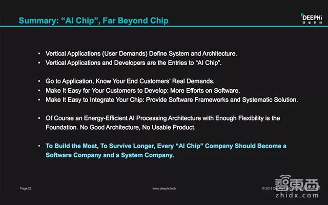 想要构建起产品的护城河,还有一个重要的点就是增加产品的不可替代性?对此姚颂也分享了自己的观点,他认为有五点需要AI芯片研发公司注意:1、在芯片设计时候,明确知道最终用户的需求;2、缩短开发周期,将芯片开发的难度降到最低;3、将芯片集成到系统中,使其运行更加简单;4、尽可能减少第三方的协作5、为用户提供更多的参考设计。