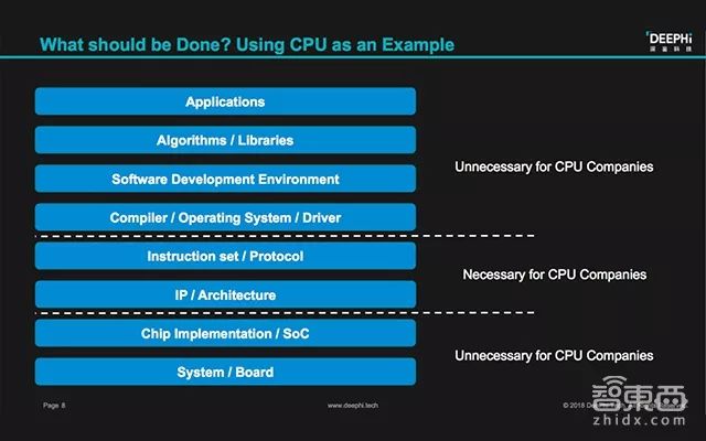 在明确了不同层级的AI定义层级后,姚颂继续深入到一家做AI芯片的企业需要做哪些工作。姚颂说做AI芯片并不像大家想的仅仅做个芯片这么简单,他以做CPU为例给出了从应用到最终系统的八个层次。
