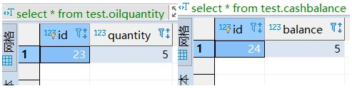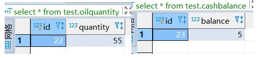 查看数据库,因为没开启事务,所以数据已经正确插入到表中,并且由于oilQuantity仓储未更新,所以数值正确,从断点处继续执行