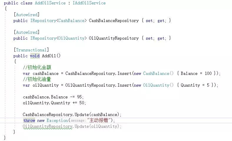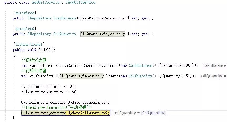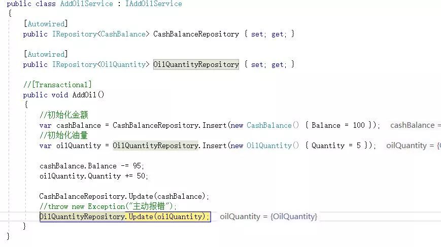 定义一个加油的服务类接口IAddOilService和接口的实现类AddOilService,可以从代码中看到,我们通过属性注入添加了CashBalanceRepository和OilQuantityRepository,通过[Transactional]标注AddOil方法,使其成为事物性操作,AddOil主要就是初始化金额和油量,然后进行加减操作,最后更新。
