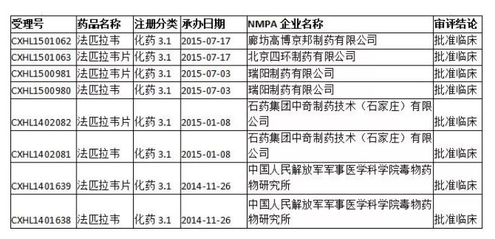 到目前为止,包括中国人民解放军军事医学科学院毒物药物研究、石药集团中奇制药技术(石家庄)有限公司、瑞阳制药有限公司等在内的单位已经申报注册法匹拉韦及相关制品,并且已经被批准临床。