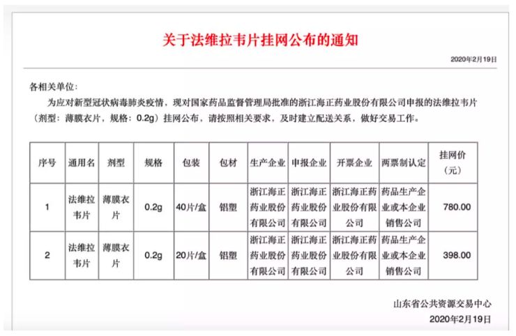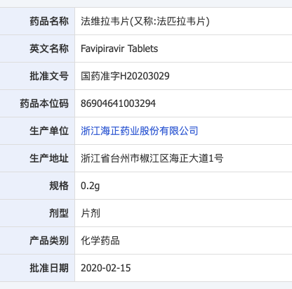 就在同一天,海正药业研制的 “法维拉韦片” 正式获得国家药监局批准上市,这是在疫情期间全国第一个批准上市的对新冠肺炎具有潜在疗效的药物。