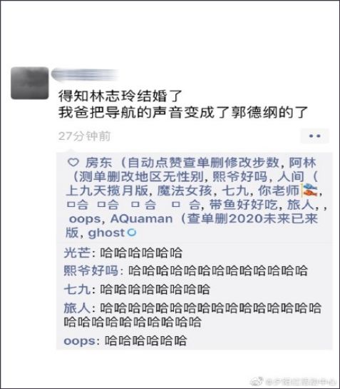 有网友在朋友圈里调侃,“得知林志玲结婚了,我爸把导航语音换成郭德纲的了”,引发了不少共鸣,还被不少网友转发;还有网友发微博“我默默的把离线语音设置成了@罗永浩老师的声音”,罗永浩转发该微博称“别这样,我也结婚了……你还是改回林志玲吧。其实……听声音听不出来她结没结婚。想开点儿,我们一起祝她幸福吧。”