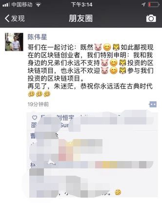 3月2日区块链知名投资人陈伟星透过朋友圈表示,今后永远不支持朱啸虎投资的任何区块链项目,也不欢迎朱啸虎参与自己投资的区块链项目。并在朋友圈称“再见了,朱迷茫,恭祝你永远生活在古典时代。”有趣的是,陈卫星并没有在朋友圈中点出朱啸虎的名字,而是用微信符号猪、笑脸、和老虎表示。