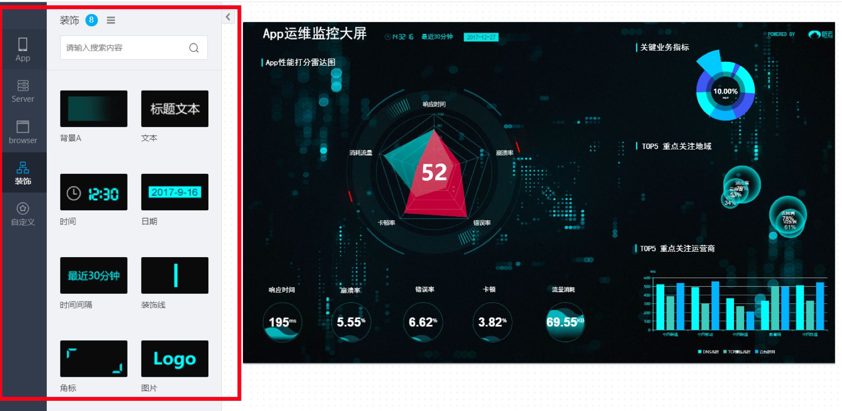 在数据可视化已经成为企业不可或缺因素的今天,为了满足大屏可自由接入数据、自由布局等更多场景的使用,听云于2017年终重磅推出3.0版IT智慧运维大屏。