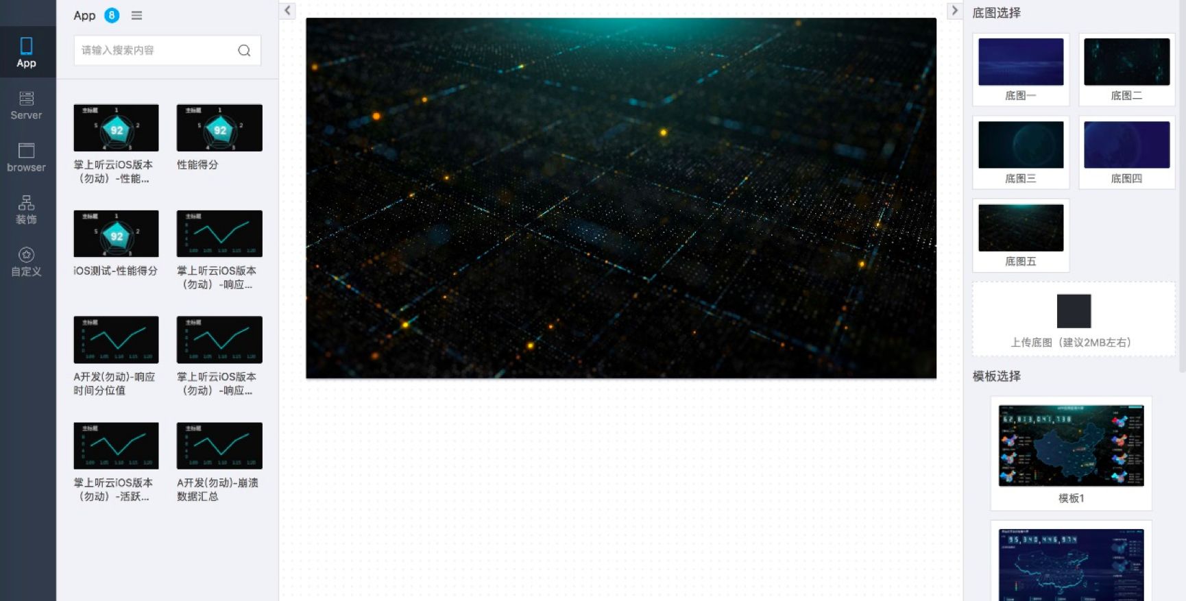 之后就进入到App大屏配置界面,这里提供自定义底图和多个模板的选择