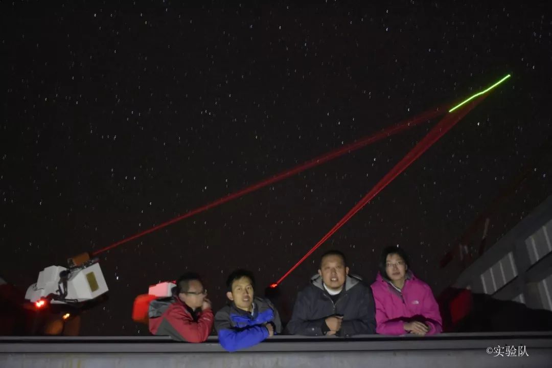 阿里地面站与墨子号卫星进行星地实验的场景,绿色光为卫星发射的信标光、红色为地面发射的信标光