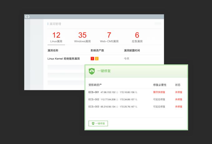 漏洞修复:基于自主研发的跨平台漏洞扫描及修复引擎,帮助用户实现同时对多个系统和应用进行扫描和修复的运维工作,目前已支持Windows系统、阿里云提供的第三方Linux版本、主流的CMS系统,同时还能检测官方未能提供补丁的系统或是应用的应急漏洞。