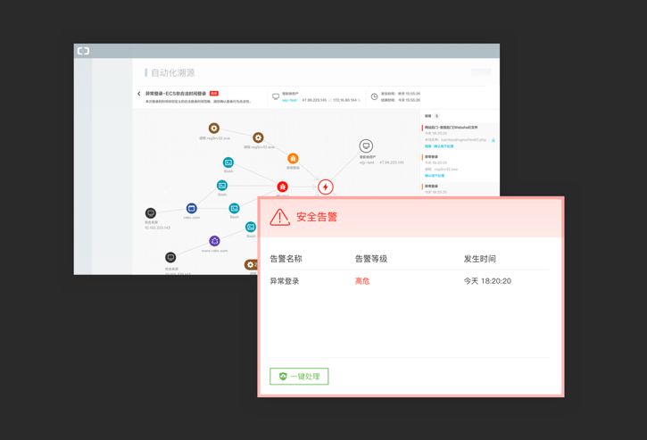 由于云上数据天然融合,阿里云安全中心将各个产品进行深度整合,基于阿里云的深度学习能力、海量数据以及强大的算力优势,实现了威胁告警、攻击事件的实时检测和自动化关联分析,从而挖掘出经过伪装的潜在威胁,大大降低了人力成本和时间成本,让黑客、挂马后门程序无所遁行。