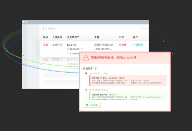 云安全中心基于云的原生优势,可以全面收集和分析各个维度的安全日志,为用户提供一个全知视角的安全管理中心,并通过可视化的界面,呈现给用户。用户只需要花几分钟通过几个鼠标点击动作就可以看到整个攻击过程,包括攻击时间、外部IP、被利用的系统漏洞等信息,并可以对恶意程序进行一键隔离,或是阻断恶意IP的访问。彻底告别传统方式下通过逐个手动配置安全产品来进行防护和溯源的方式,大大提升了效率。
