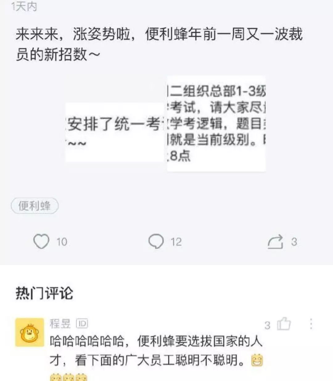 此前,认证为便利蜂的多名员工在脉脉上表示,便利蜂正在裁员,HR 让员工主动离职,不离职的以违纪为由,「第一批是应届生被裁 30%;第二批是社招末尾淘汰,且没有赔偿。」对此,便利蜂回应称是正常年末绩效考核,「有些员工绩效没达标」。(来源:虎嗅网)