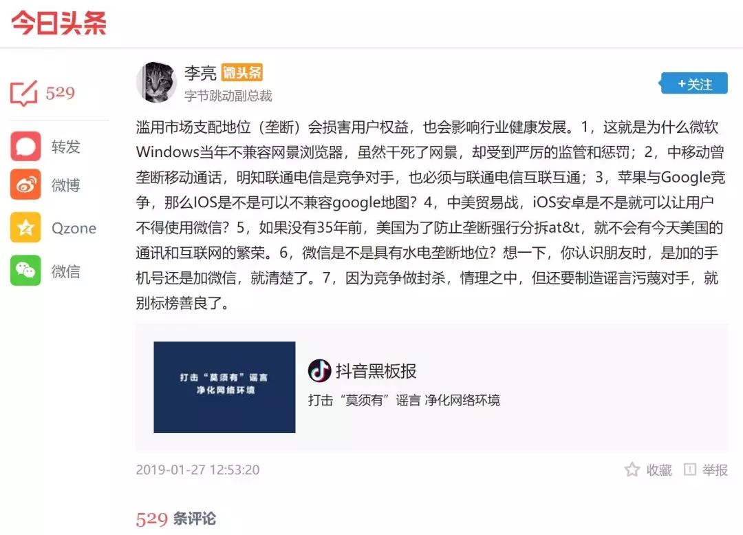 字节跳动副总裁李亮昨日午间在今日头条上发表言论称:「滥用市场支配地位(垄断)会损害用户权益,也会影响行业健康发展。」他说:「微信是不是具有水电垄断地位?想一下,你认识朋友时,是加的手机号还是微信号,就清楚了。」