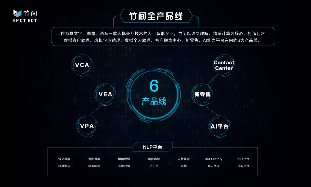 竹间希望AI不仅是一项“黑科技”,更能解决商业场景中的高价值问题。为此竹间将自然语言理解、多模态情感识别及深度学习技术与多个垂直领域结合,推出了一系列AI解决方案。产品涵盖六大产品线,VCA(虚拟客户助理)、VEA(虚拟企业助理)、VPA(虚拟个人助理)、客户联络中心、新零售及AI平台。