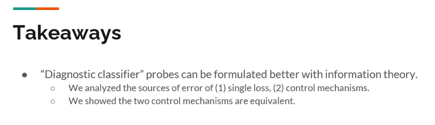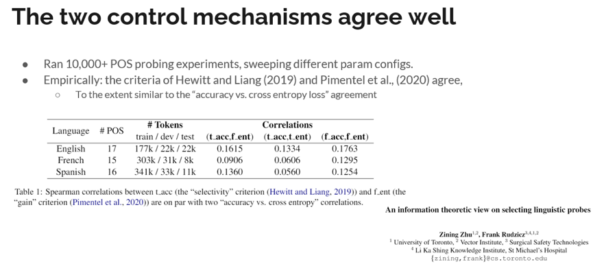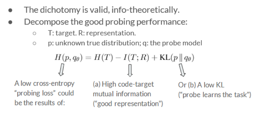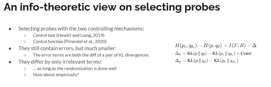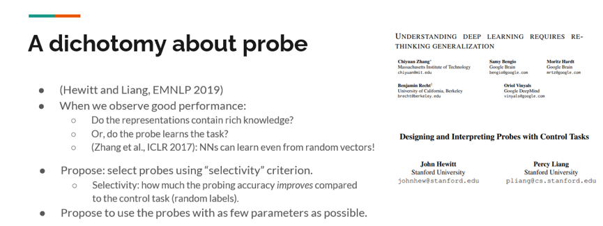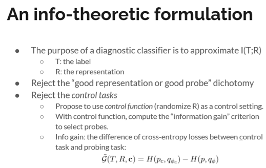 当设置好语言探针任务之后,就能够使用探针去寻找不同的语言信息,例如语法信息。Hewitt在2019年发表于NAACL的《A Structural Probe for Finding Syntax in Word Representations》中使用探针去寻找句子中的单词与单词在语法树上的距离,因此他们的输入就是句子的表征,而输出的是词与词的语法距离。他们在文章中表明,在BERT模型中,较低层的表征含有较多的语法树距离信息,但是在模型的高层中这类信息相对较少。Tenney在文章《BERT Rediscovers the Classical NLP Pipeline》中发现高层中包含的语义信息比较多,低层中语法信息比较多。这就像一个传统的Pipeline形式,可解释性强且信息局部化,其中每个流程都在完成不同的工作,且是严格按照一定顺序进行的,例如句法分析,语法分析,命名实体识别,语义角色标注,然后共指消解。其先在低层处理一些语法特征,传统的办法有手动提取特征,而在高层中通过算法提取一些语义信息,即形成低层语法,高层语义的模式。Tenney组发现BERT模型中也呈现出了类似的特征。作者在他的论文《Examining the rhetorical capacities of neural language models》对修辞特征进行了探索,他们把探针的输入设置成文章的表征,进而观察文章中有多少解释或者转折的信息,并且观察到双向的语言模型在这方面表现比单向的语言模型要好。语言探针容易设置:输入表征、让分类器预测一些诊断任务。探针结果的结果容易解读:“诊断探针任务”的效果好,则可以推测“表征的知识丰富”。但是这种传统的语言探针模式在2019年受到了挑战。2019年EMNLP获得最佳论文奖第二名的斯坦福大学的研究团队在《Designing and Interpreting Probes with Control Tasks》(作者为 John Hewitt、Percy Liang)一文种提出:当我们能够观察到好的表现的时候,不一定是因为这个表征具有很多的信息,也有可能是因为探针学会了这项任务。这是因为探针本身就是神经网络,而神经网络甚至能够从随机的向量里面学习改进(参考:2017年Zhang的《Understanding Deep Learning Requires Rethinking Generalization》)。因此只要所用的数据集够小,而探针的设置够大,探针甚至能够通过这个数据集建模。因此,他们提出使用“Selectivity”标准去选择探测器。Selectivity标准是:和使用了随机标签的控制任务相比,探针的精度提高了多少。探针本身就能够进行学习,但是在“控制任务”里面,探针也会学习。这些学到的知识会减法中被抵消。此外,Hewitt and Liang还推荐使用更简单的探针模型,因为探针的参数越少,它的学习能力就越低。针对Hewitt& Liang的文章,几个月之后,ETH Zurich的Tiago Pimentel等人在ACL 2020文章《Information-Theoretic Probing for Linguistic Structure》中反驳了他的观点。首先,他们试图从信息论的角度来定义探针任务。他们提出,语言探针的目的在于计算表征R和任务T之间有多少互信息(code-target mutual information, I(T;R))。在NLP模型中,我们通常认为词语或者句子的表示蕴含了一定的语言学性质,比如句法信息或者语义信息。为了证明这一点,人们设置了探针任务,它是关注于简单的语言学性质的分类任务。比如对于一个LSTM encoder,使用句子 embedding 来训练一个时态分类器,如果能够得到正确的分类,则认为这个 embedding 包含了一定的时态信息。Hewitt的文章认为探测任务应该使用比较简单的模型,比如使用浅层感知机。而Pimentel等人这篇文章反驳了这一观点,认为探测任务应该使用表现尽可能好的探针模型,他们反对Hewitt提出的二分法解释。Pimentel也反对使用控制任务;他们提出控制函数作为控制设置。控制函数与控制任务的区别在于控制函数将表征随机化,而控制任务将标签随机化。在后面的实验中,我们将证实这两者是等价的。此外,Pimentel还使用了信息增益这个判断标准来选择语言探针,信息增益是控制任务和探测任务交叉熵损失的差异,用此来近似信息的增量。这两篇文章形成了一种辩论,我们试图解释这两个文章里面观点不同的地方。 3