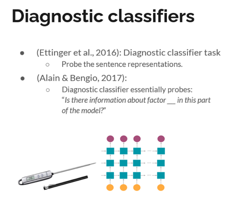 最近,神经网络在NLP中的作用越来越重要,在上面列出的一些任务中,神经网络是需要不同的知识和能力。在翻译任务中,需要翻译的语句需要由深度语言模型用另外一种语法去表达语义信息,这表明模型需要具有在不同语言中应用语法的知识。而语言的可接收性任务中则同样面对翻译问题中的语句通顺问题。同样涉及到需要不同的语法去表达语义信息的还有Paraphrase任务。上述任务共同包含的能力需求是识别语义的前后包含关系,例如前一句有没有包含第二句话的条件。模型还应该具有常识判断能力。例如:大象不能放到冰箱里面,因为它太大了,这个它指的是大象还是冰箱。而模型要想正确的理解“它”是大象还是冰箱,就必须知道现实生活中大象和冰箱的大小概念,这样才能正确理解是大象太大了。而相反的语句,大象不能放到冰箱里,因为它太小了,模型则能够理解是冰箱太小了。另外在做任务时,神经模型还需要理解语义信息,例如 Quora Question Pairs任务中,需要判断两个问题是否在提问相同的问题。值得考虑的一点是,在这些任务中神经模型能够出色的完成任务,这意味这它们应该具有很多相关知识。因此需要关注它们具有多少知识,如果它们具有这些知识,它们是从什么时候开始学会这些知识的。它们对于这些知识的储存方式是不是储存在一部分的单元里面,如果是的话我们能不能把这些单元提取出来,或者改进其他的单元。而知道这些知识的储存位置对于如何设计更好的模型提供了帮助。探究这个问题的方法是使用诊断探针。在2016年的时候,Ettinger 在文章《Probing for semantic evidence of composition by means of simple classification tasks》中提出了探针诊断。他们设计的方法是使用分类器,分类器算法的输入是句子的表征,输出的是语言任务,而使用者只需要手动指定一些语言任务,然后让分类器去学习。如果分类器能很容易学会,即获得很高的正确率或很低的交叉熵损失函数,就说明表征中有很多很容易解码的信息。Bengio在文章《Understanding intermediate layers using linear classifier probes》中提出,对诊断探针的分类器的疑问可以概括为,在模型的阵列当中是否包含这块信息。因为在一个深度模型当中,从低层到高层所包含的信息是减少的,这主要因为信息处理的不平等,模型会对信息做一些处理,导致信息的损失,但是会尽量保留有用信息。所以越往高层走,任务相关的信息占的比例会越来越高的,会越来越容易解码。 2
