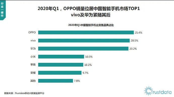 Trustdata 发布的 “2020 年 Q1 中国智能手机出货量品牌占比”,OPPO 出货量位居中国智能手机市场 TOP1。另外,三月份的 5G 手机销量也再创新高。四月份也发布了许多 5G 手机, 可以期待一下四月份的销量了。