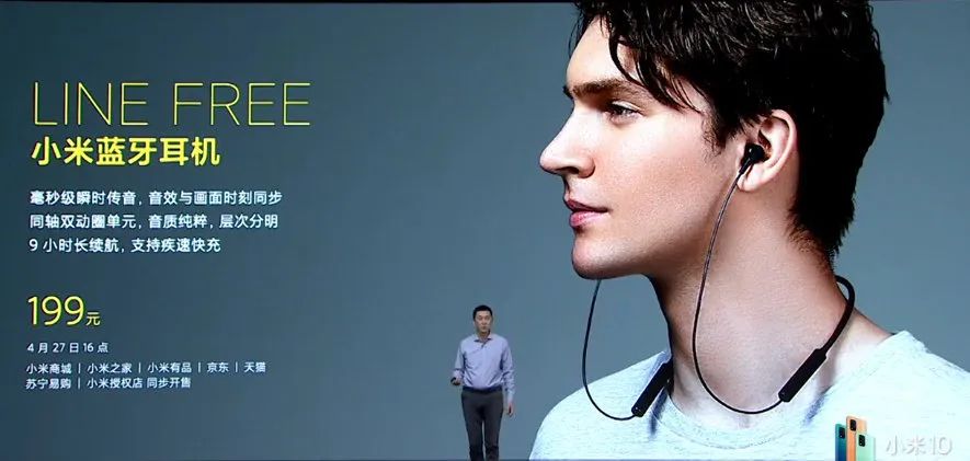 小米 LINE FREE 蓝牙耳机,9 小时的续航时间,支持快充。官方售价:199 元。