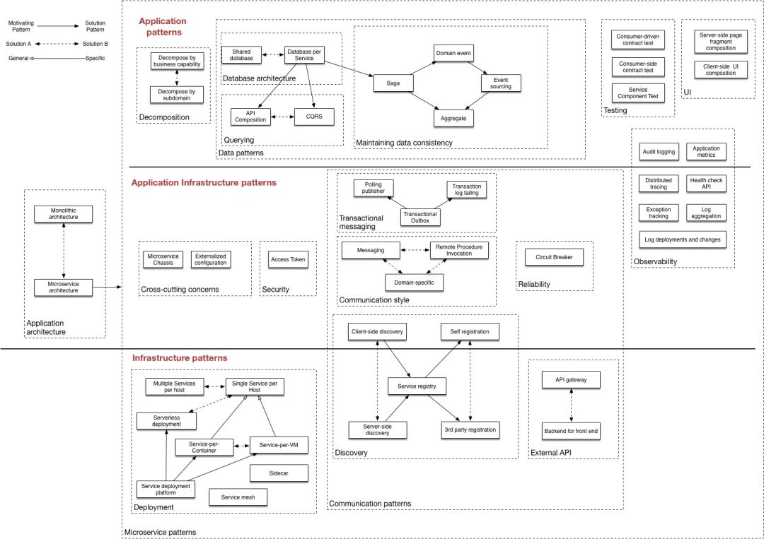 严格的说,Chris Richardson 的“单体架构模式“是一种对现状的和举例,并没有给出其特征和方法的描述,因此不能称之为模式。而”微服务架构模式“则又是一系列模式的总和,如下图所示: