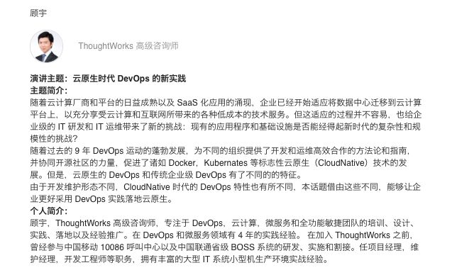 看完此文,才发现“微服务”概念有这么长的“纠缠史”,看看 ThoughtWorks 高级咨询师顾宇老师在 DOIS 2018 · 深圳站的精彩议题(这是一个当下极具吸引力的话题):云原生时代 DevOps 的新实践。