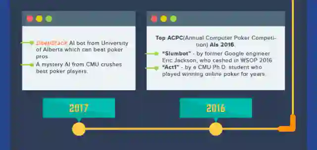 10. 2016年,在ACPC上出现了两个顶级的AI:1)前谷歌工程师Eric Jackson 开发的Slumbot,在WSOP上大赚一笔;2)CMU 博士生开发的“Act1”数年来在线上扑克对战中保持常胜。