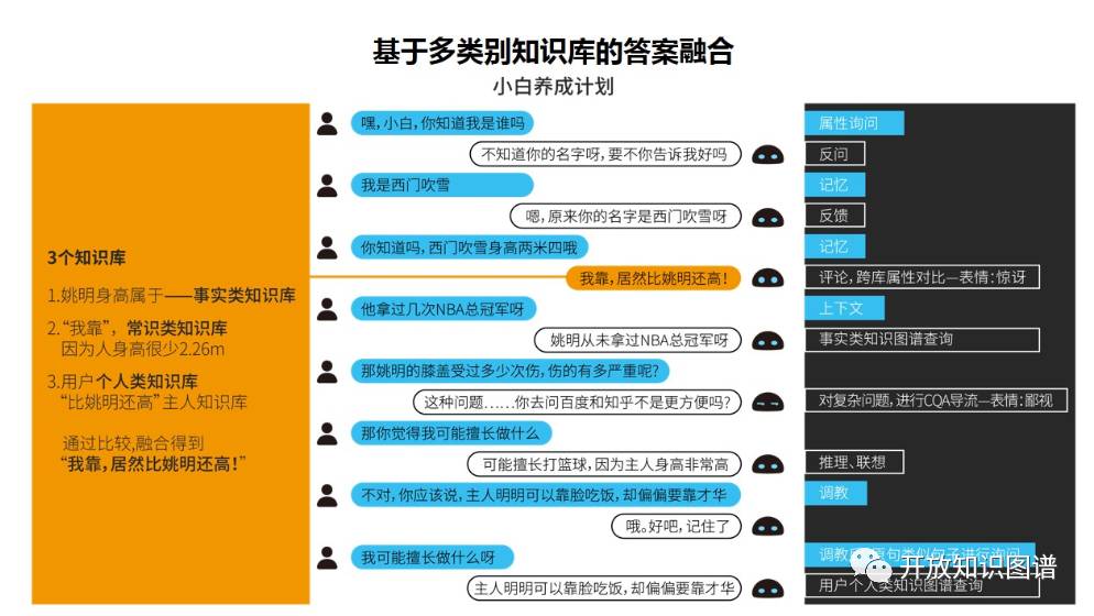 知识问答中非常有挑战的是 Multi-KB 环境下的问答。这对问句分解和知识源选择等都提出了更高的要求。更有挑战的是:不仅仅一句很复杂的话会涉及多个 KB,即使对于很简单的话,往往在聊天的多轮交互中,会逐步涉及不同方面的 KB,甚至需要在某个看似不经意的回复中用到某个 KB。在研制小白的多轮对话中,需要考虑属性询问、反问、记忆、反馈、基于跨库属性比对后的评论,基于上下文的问答、事实类知识图谱查询、对复杂问题的导流、推理联想,调教以及用户类知识图谱的查询等。例子“我靠,居然比姚明还高”就是一个多知识库问答之后的回复生成。其中,姚明身高属于事实类知识库、“我靠”等惊讶的回复,是通过常识知识库了解到很少有人身高超过 2.26 米,而通过用户个人知识,其身高数值比姚明还高,而返回“比姚明还高”的回复片段,最后通过融合,得到最终的返回。