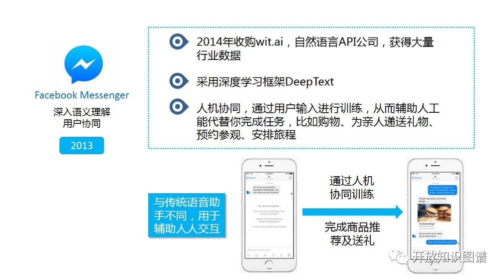 之前已经提到 Facebook Messenger 是一个庞大的 Bot 平台,有非常活跃的开发者群体,平台包含上万种 Bots。针对 Messenger,我想讲以下几点:第一,它在 2014 年收购了 wit.ai。Wit.ai 类似于谷歌所收购的 api.ai,包含大量的行业相关或场景相关的对话。基于以上高质量海量的对话数据,Facebook 基于深度学习技术推出了一个用于自然语言处理的框架叫 DeepText,用于自然语言表示学习和各种分类等任务。有名的 Fast Text 也包含在内。今年 Facebook 更是基于 Deep Text 推出了 CLUE,进一步提高了其易用性,有兴趣的可以去进一步了解一下。通过以上的数据和技术积累,Facebook 就可快速构建一个端到端的 Chatbot 或者问答系统。此外,还有一点需要强调的是,我们可以发现 Facebook Bot 的很多应用场景涉及到购物、递送礼物、预约参观和安排旅程等非实时任务,即相对比较复杂,但不要求马上得到反馈。传统的做法是,通过指派一名客服来对接,提供进一步的服务。对于这些非实时任务,Facebook 结合机器返回的自动化推荐结果和人工的进一步编辑和审核来保证用户体验的同时也降低了纯人工对接存在效率低、工作量大等弊端。而这也是近期大家很推崇的人机融合,即赋予人工智能新的内涵:Artificial Intelligence+Human Intelligence(人类智能)=Augmented Intelligence(增强智能)。