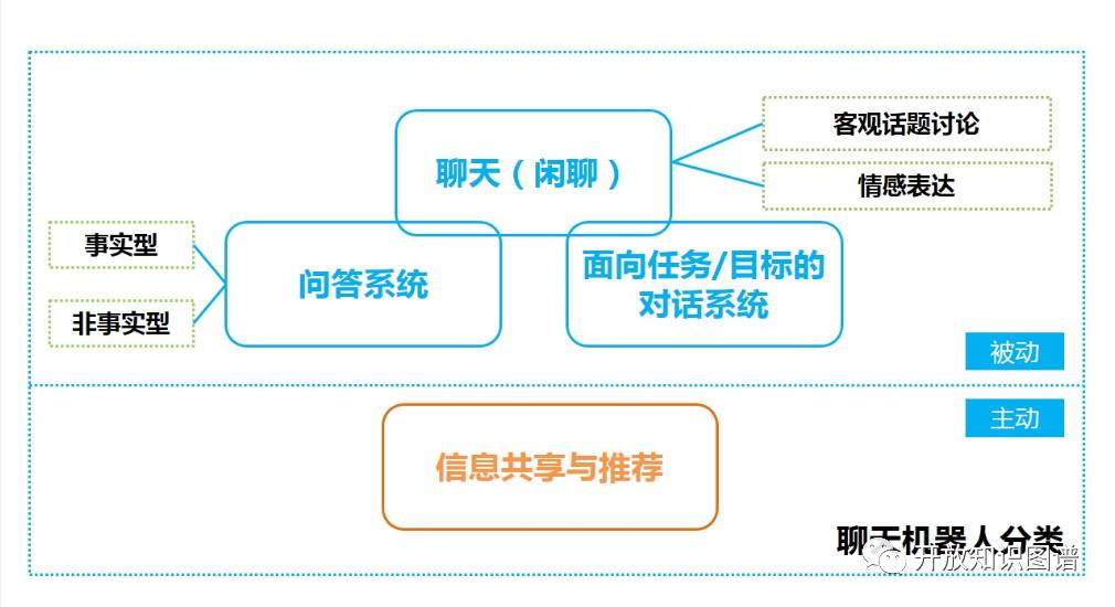 我们对聊天机器人按照功能和交互方式等二个维度可以进一步细分为四类。交互方式可以分为主动交互或被动交互。目前大家接触到的大部分聊天机器人都属于被动交互的范畴,即由用户发起对话,机器理解对话并作出相应的响应。而主动交互能更好体现机器人和用户之间的对等关系,即通过共享或推荐用户感兴趣或热点事件等由机器人首先发起。目前主动交互更多作为传统交互方式的一种补充,作为辅助手段,并未大规模得到广泛使用。从功能角度来看,聊天机器人可以细分为以闲聊为主的聊天,问答和面向任务或目标的对话。其中,若根据场景切分,闲聊可以进一步分为情感交流和针对客观话题的讨论。问答系统需要不仅考虑如 What、Who、Which、Where 和 When 等事实型问答(Factoid QA),也需要考虑如 How 和 Why 等非事实型问答。