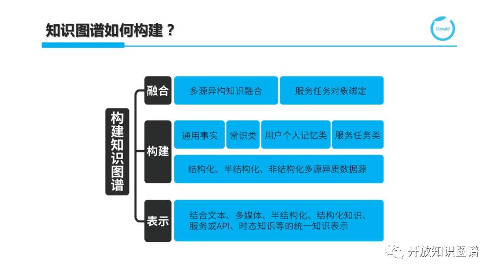 从更技术的角度来说,我们需要考虑知识图谱将如何构建。这里不仅包含如何结合文本、多媒体、半结构化、结构化知识、服务或 API,以及时态知识等的统一知识表示。在此基础上,需要进一步考虑如何结合结构化(如关系型数据库)、半结构化(HTML 或 XML)和非结构化(文本、图像等)多源异质数据源来分别构建通用事实类(各种领域相关实体知识)、常识类、用户个人记忆类、机器人自我认知类和服务任务类知识库等。针对不同类型的数据和不同种类的知识构建,有相应的构建技术,如针对结构化数据的知识映射、针对半结构化知识的包装器(Wrapper),以及针对非结构化知识的文本挖掘和自然语言处理。文本挖掘充分利用 Web 或大规模语料库的冗余信息来发现隐含的模式;而自然语言处理更多是做各种知识抽取(开放或确定 schema 的)。为了得到融合的图谱,我们除了离线的多源异构的知识融合,还需要额外考虑服务任务类动态知识的对象绑定,这块工作往往是在线完成的,相当于根据不同的交互,在线动态扩充知识图谱并实例化的过程。
