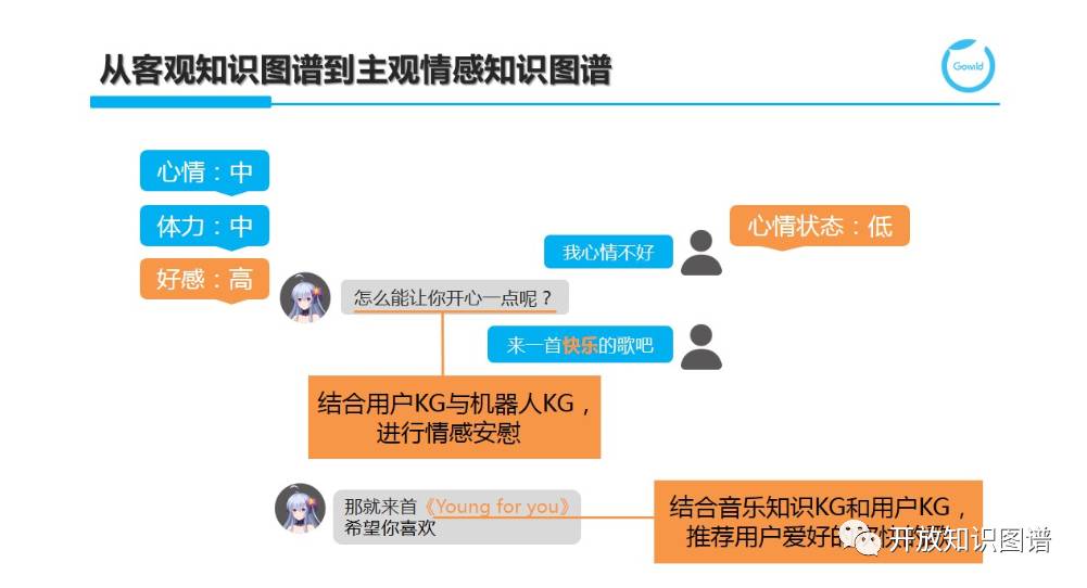 第三,机器人不能只是冷冰冰的回答用户的问题或帮助用户完成特定功能。它需要感知用户的情感并在输出答案回复的同时伴随着相应的情感,这样才更加拟人化。我们发现,之前构建的知识图谱大多是客观的,即描述一些客观的事实。如何在结合个性化图谱时,能包括一些主观知识,进而刻画机器人或用户的情感元素。例如,用户说:“我心情不好”。这属于闲聊中的情感表达范畴。这时需要将用户当前的心情状态更新到用户图谱的对应维度数值中。相应地,机器人也会有自己的心情、体力,甚至和用户之间的好感度关联。当此时,机器人心情不错,同时和用户很亲密时,它就会主动关心用户。这样结合机器人和用户情感因素的动态回复会更加温馨和贴合场景。当在多轮对话时,用户进一步说:“来一首快乐的歌吧”。需要进一步结合音乐知识 KG(快乐作为歌曲的曲风或风格标签)和用户 KG 中的音乐偏好,推荐用户喜好的欢快的歌。