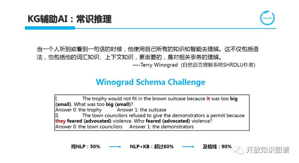 KG 也可辅助通用人工智能(Artificial General Intelligence,AGI),即在常识推理方面起到作用。过去人们常用图灵测试对机器的智能进行评估,近年来,Winograd Schema Challenge 逐渐进入大家的视线。这里举一个指代消解的例子。指代消解是一个经典 NLP 任务,旨在将代词指向具名实体。例如,Thetrophy would not fit in the brown suitcase because itwas too big (small). What was too big (small)? 当我们描述 it 是 big 时,人们很容易理解这时候是在说奖杯(trophy);而当 it 与 small 搭配时,我们也很容易识别出在抱怨 suitcase 太小。这个看似非常容易的问题,却难倒了机器,这是因为人具有非常庞大的世界知识(world knowledge)和常识知识(common-sense knowledge)。当我们仅采用 NLP 技术来努力理解并给出答案时,正确率仅 50%;当结合知识时,正确率提升到了 60%,而及格线是 90%。因此,我们离真正的通用智能还有很漫长的路要走,需要更多的技术突破和数据积累才能完成这项挑战。