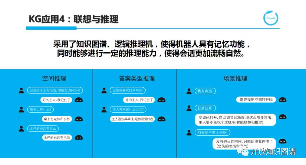 第四个 KG 的应用就是联想和推理。这里我列举了三种推理,但实际情况下不局限于这三种。第一种是空间推理,比如说“桌子上面有电脑,电脑旁边有水杯”,然后问,“桌子上面有什么”,正确的回答是电脑和水杯。