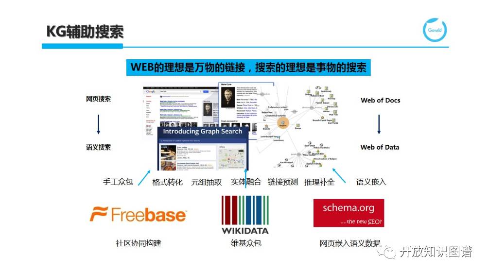 知识图谱于 2012 年由谷歌提出,旨在提供更好的搜索体验。随着整个 Web 从原先由网页和超链接构成的 Web of Docs 转换为由实体或概念及他们之间的关系构成的 Web of Data,谷歌提出了更准确的语义搜索,旨在解决原有的关键字搜索仅基于字符串无法理解内容语义的局限。在 KG 发展的浪潮中,也诞生了基于社区协同构建的众包典范 Freebase。而谷歌的 Google KG 也是基于 Freebase 逐步发展起来的。同样还有 Wikimedia 社区所推出的 WikiData 项目,目前 Freebase 也已经关闭,并将数据等均贡献给了 WikiData 做进一步发展。此外,作为谷歌、Bing、Yahoo!和Yandex(俄罗斯搜索引擎)共同推出的 Schema.org,通过鼓励站点所有者(Site Owner)在其页面中添加符合 Schema.org 分类体系(及关联属性等)规范的语义知识片段(以嵌入在 HTML 页面中的 RDFa 或 Microformats 等形式出现)来扩充和完善知识图谱。据悉,25% 的站点和 30% 的页面包括 Schema.org 的标注。对应的回报是提升特定关键字或实体查询时相关站点(提供与关键字或实体相关的高质量语义标注知识)的搜索排名,从而起到免费搜索引擎优化(SEO)的作用。当然,KG 不仅仅只有以各种类型的实体为节点的实体图,Facebook 则呈现了另一种关联人、事、物的兴趣图谱。相比谷歌的实体图谱,兴趣图谱节点和边的类型没有那么丰富,但是包含的节点数更多,稠密程度也更高。对于兴趣图谱上的搜索或问答也提出了不同的要求。为此,Facebook 专门提出了一种针对性的图搜索,内部的项目名叫 Unicorn(独角兽),有兴趣的可以去了解一下。