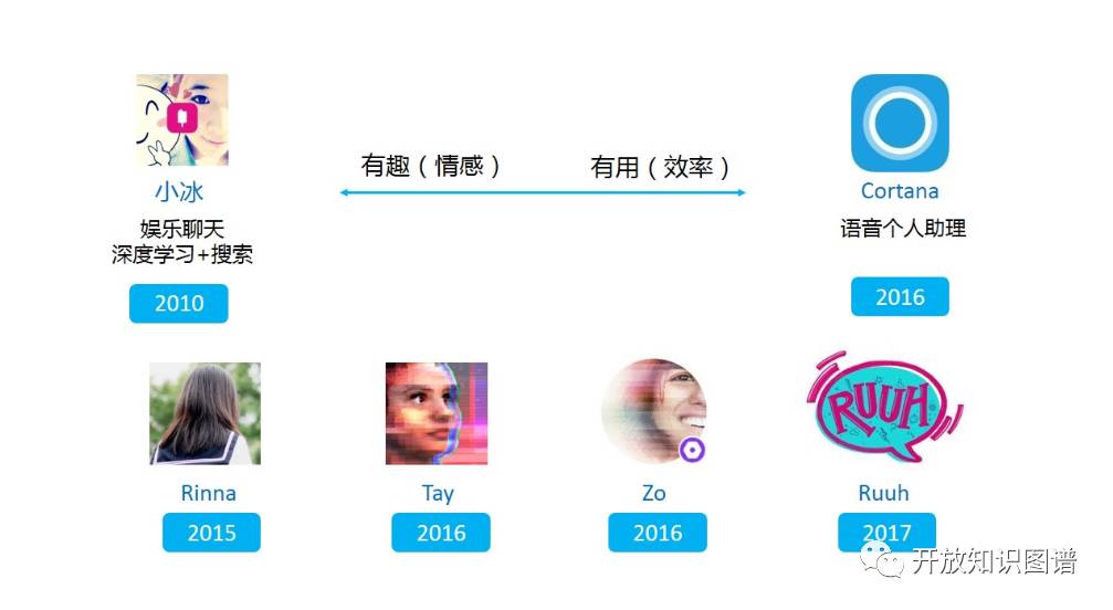 正如之前介绍的那样,微软针对娱乐化和工具化这两个截然不同的定位,分别推出了小冰和小娜(Cortana)。小娜,作为嵌入在 Windows 或 Windows Mobile 等微软操作系统内核的语音个人助理,承载着类似 Siri 或 Viv 的角色,它的目的是提升用户的工作效率,据说 Cortana 有 1.5 亿多用户,这也使得微软吸引到 Bengio 这样的大师作为顾问加入。另一方面,小冰是微软中国团队推出的娱乐聊天机器人。她的人设是一位 16 岁的少女。小冰是一个基于搜索的回复检索系统。通过各种基于深度学习的语义匹配算法,从海量的问答对语料中返回最佳的回复(Message response 而非 Answer)。小冰也会不定期推出新的技能供大家使用,这些技能往往包含了微软团队在图像理解、语音和自然语言理解方面的各种小应用尝试。更值得一提的是:微软针对日本、北美和欧洲等市场陆续推出了具有不同人设的少女如 Rinna、Tay 和 Zo,她们往往可以方便的通过微信、微博或 Twitter 等平台进行交流。