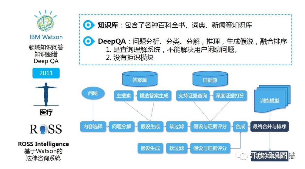 Watson 系统是典型的问答系统,其由 IBM 研究院在 2011 年推出,参加美国知识竞赛 Jeopardy!(危险边缘)并挑落人类冠军而名声大躁。相比 AlphaGo 或早年 IBM 研制的战胜卡斯帕罗夫的国际象棋人工智能程序深蓝,Watson 具有更清晰的商业路径。IBM 斥巨资成立医疗事业部,并与 MD Anderson 等知名医疗机构合作推出面对特定病种(尤其是癌症)的辅助诊断 AI 医生。与此同时,Ross Intelligence 依托 Watson 认知计算平台推出了法律咨询系统。回到技术层面,Watson 所用到的知识库是一个广义的知识库,不仅包含各种结构化知识、也包含各种文本语料和语言学知识。整个流程称为 Deep QA,包含问题分解、假设生成、基于证据的融合排序等关键步骤。这里的 Deep QA 并非指通过深度学习(Deep Learning)技术来提供问答。事实上,Watson 诞生于深度学习大热之前,这里的 Deep 是指通过深度解析(Deep Parsing)来实现对问句的真正理解。