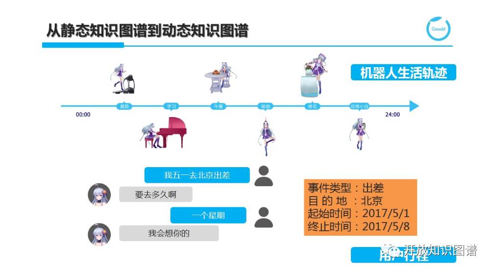 其次,我们的世界不仅仅是静态的,而是动态地反映各种事物在时空上的变化。因此,我们不仅仅需要刚刚谈到的静态图谱,而是需要思考如何表示和应用动态图谱。对于一个机器人,它从早到晚会做不同的事情,也就是有自己的生活规则。我们该如何刻画生活轨迹呢?这就需要我们在图谱中体现时态知识。另一个例子,用户行程,即对于用户图谱,需要记住用户各种已经发生、正在星星或即将发生的事件。图谱中的行程不仅仅是一个关系或属性,而是一个由多元(N-ary)组成的事件。我们需要定义多种事件类型,并刻画时间和空间两个维度。