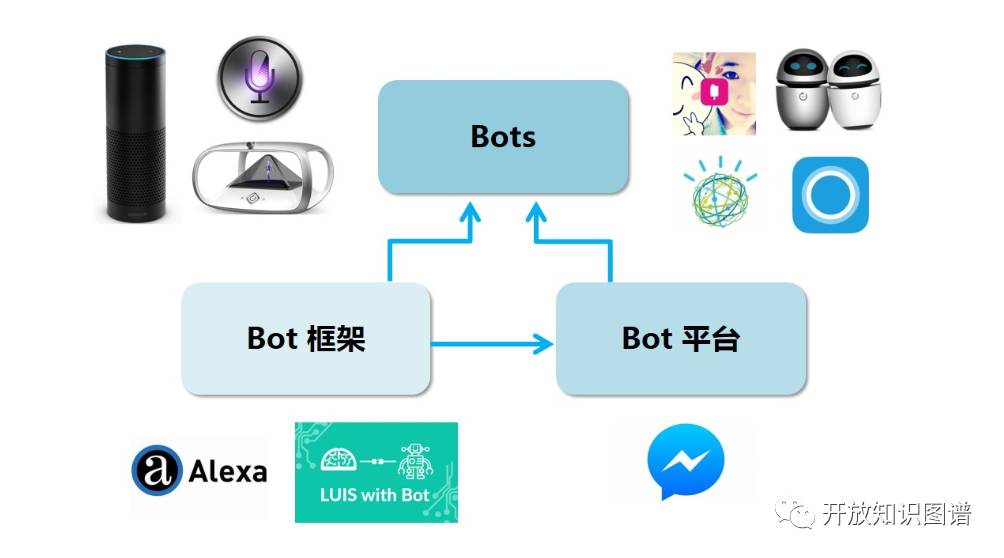 围绕 Bots 生态圈,有些在做实际的 Chatbots,既有硬件形态的 Amazon Echo 及狗尾草公司推出的公子小白和 Holoera 等,也有纯软件的如苹果的 Siri 和微软的小冰等。除此之外,为了加速实际 Bots 的研发,不少巨头或创业企业开始对外提供 Bot 框架(Bot Framework),以 SDK 或 Saas 服务的形态供第三方公司使用来构建特定应用和领域的聊天机器人,这里的典型代表包括支持 Echo 的 Amazon Alexa 和微软推出的包含在 Cognitive Services 大框架下的 LUIS with Bot 等。更进一步,除了提供开发 Bot 的 API,Bot 平台(Bot Platform)进一步考虑开发得到的 Bot 如何部署到一些常用平台中如微信或 Facebook 等。