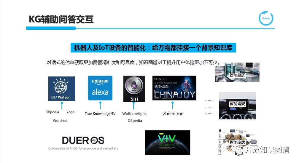 除了搜索,知识图谱也被广泛用于各种问答交互场景中。Watson 背后依托 DBpedia 和 Yago 等百科知识库和 WordNet 等语言学知识。类似地,Alexa 也依托其早年收购的 True Knowledge 公司所积累的知识库;Siri 则利用 DBpedia 和可计算的知识服务引擎 WolframAlpha;狗尾草公司推出的虚拟美少女机器人琥珀虚颜则用到了首个中文链接知识库 Zhishi.me。伴随着机器人和 IoT 设备的智能化浪潮,智能厨房、智能驾驶和智能家居等应用层出不穷。无独有偶,百度推出的 Duer OS 和 Siri 的进化版 Viv 背后也都有海量知识库的支撑。