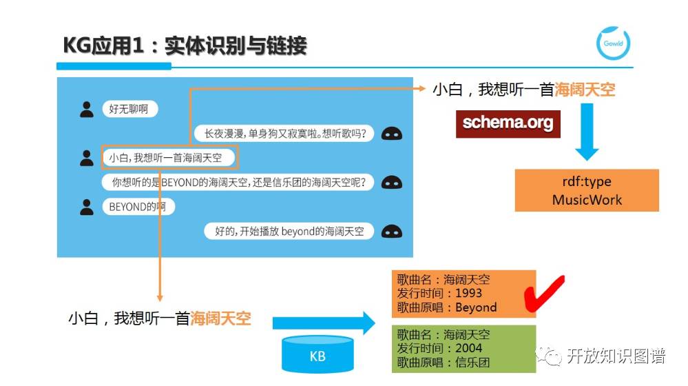 第一个应用叫实体识别和链接。实体识别称为 Named Entity Recognition,简称为 NER。在传统 NLP 任务中,仅能识别 PERSON(人物)、LOCATION(地点)、ORGANIZATION(组织机构)、DATE(时间日期)等有限类别。在实际应用中,NER 的主要挑战在于识别大量细粒度实体类型,比如以 Schema.org 作为实体类别的分类体系,这里有很多标注数据充足的大类,也有很多缺乏标注数据的小类,如何保证在小类上的识别准确率。此外,分类体系是有层次结构的,如何保证底层的细粒度类别上有令人满足的识别率。例句“我想听一首海阔天空”中的“海阔天空”通过 NER 任务可以识别为是一个音乐作品。仅仅这样是无法执行对话意图“音乐点播”的,我们需要进一步将候选链接到知识图谱中的给定实体,这一过程称为 Entity Linking。这里的核心在于歧义消解,一般借助于候选周围的其他实体或用语作为上下位来帮助去歧义。如果如例子所示,仍然无法明确是哪个实体,可通过反问来引导用户来给出更明确的实体指引。在实体链接过程中,我们所面临的挑战在于如何应对新兴实体(Emerging Entity)和实体的新兴说法(各种新说法和别名)。