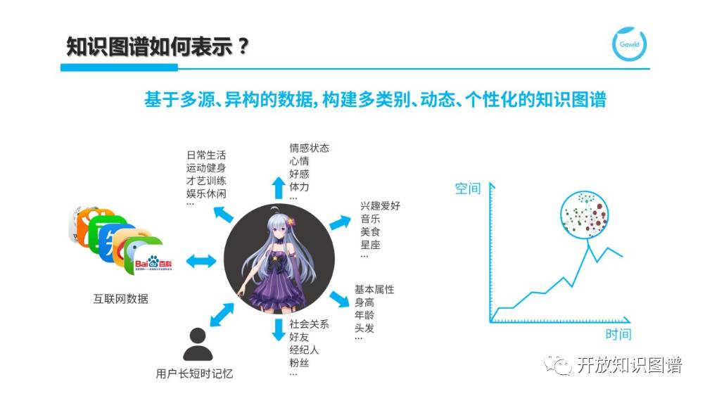 总而言之,我们需要基于不同来源异构的数据来构建包含多类别且体现动态和个性化的知识图谱。这其中包括来自互联网的数据来刻画世界知识,用户数据来刻画画像知识,以及针对机器人的各种基本属性、社会关系、情感状态、兴趣爱好、以及日常生活等静态和动态知识。而我们得到的融合图谱是时空坐标中针对特定交互场景和时间节点的一个镜像。