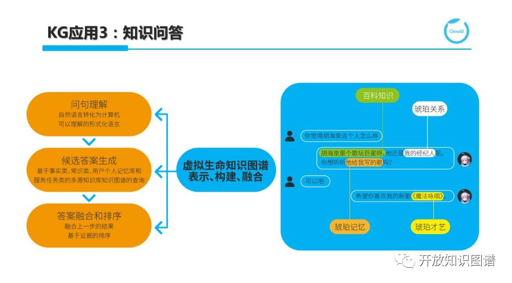 第三个应用就是知识问答(KB-QA)。其中句理解的难点在于 NLU,而候选答案生成则与检索过程关联,至于答案融合和排序,则重点考虑各种基于证据的收集和学习排序算法。这里我们看一个真实的例子,比如说“你觉得胡海泉这个人怎么样?”,这是一个意见询问类查询(opinion query),此时可以有很多回答,为了使得答案的多样化,除了利用摘要技术(summarization)从百科站点中得到“胡海泉是个歌坛巨星呀”之外,通过机器人 KG 中的经纪人关系,可以显式表明琥珀和他的关系。更进一步,可以通过琥珀记忆和技能关联,主动推荐“海泉给琥珀写的歌”。当用户给予明确的回复时,将表演自己的才艺,即唱自己的歌。在我们所描述的知识图谱下支持问答,需要额外考虑: