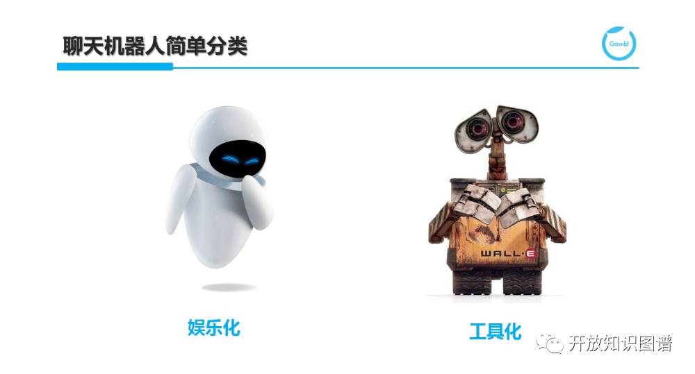 在作详细介绍之前,我们先对聊天机器人从分类角度进行一定的梳理。我们从最简单的二分类着手,即 Chatbots 根据其用途或使用场景,可以分为偏娱乐化或偏工具化。图中给出了一个鲜明的对比,白富美的 Eva 更擅长的是情感陪伴,而蓝领工人 Wall-E 则更擅长完成特定的工作。这两者由于目标不同,所以往往在 Chatbots 设计和技术选型上会存在一定的差异。微软公司很早就洞察了这一点,针对偏娱乐化场景和偏工具化的应用分别推出小冰和小娜。