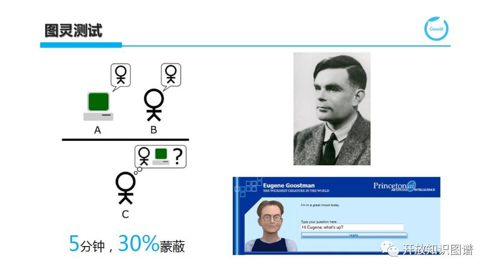 聊天机器人的成功离不开智能。而图灵测试常常被用来测试机器是否具有真的智能。图灵测试是指测试者在与被测试者(一个人和一台机器)隔开的情况下,通过一些装置(如键盘)向被测试者随意提问。进行一系列时长为 5 分钟的测试后,如果有超过 30% 的测试者不能确定出被测试者是人还是机器,那么这台机器就通过了测试,并被认为具有人类智能。图灵测试一词来源于计算机科学和密码学的先驱阿兰•麦席森•图灵写于 1950 年的一篇论文《计算机器与智能》,其中 30% 是图灵对 2000 年时的机器思考能力的一个预测,目前我们已远远落后于这个预测。2014 年 6 月 7 号,正值图灵逝世 60 周年纪念日,一款名为尤金·古斯特曼(Eugene Goostmanz)的聊天机器人,它伪装成了一个用第二语言沟通的 13 岁乌克兰男孩儿,成功“骗过”了测试者,通过了图灵测试。不过事后有很多质疑。首先,这个聊天机器人号称只有 13 岁,并使用第二语言来回答问题,以此作为重大缺陷的借口。另外,测试者只有 5 分钟与之展开互动,大大增加了他们在短期内被“欺骗”的概率。尤金无法一直保持对话的顺畅性,他会不断重复自己的话,还经常使用聊天机器人典型的无推断型回应方式。